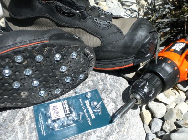 As soon as I take them out of the box I stud the sole and heel. I prefer Simms boots but their own brand studs while good are expensive, there are alternatives. Snowbee sell screw in wading studs in packs of forty for around ten bucks. If you hunted around the Internet you could probably get them cheaper than that because they appear to be ordinary hex head sheet screws. Applying them to your boots couldn’t be easier. The universal adapter that comes with most drills is a perfect fit for the screw heads and makes screwing them in a doddle. But a little tip … replace worn studs before the heads wear down completely or you won't be able to unscrew them with the drill.