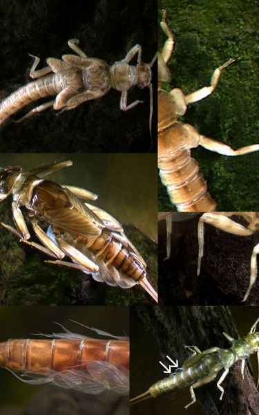 First of all check out the wing cases. Stonefly nymphs have two very obvious wing pads on top of the thorax. Something to keep in mind when you start tying your own. Mayfly nymphs only have one.