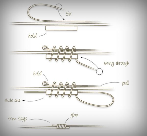 Tie a small swivel on the other end, this provides a convenient connection point for the rest of the leader and also helps the leader to begin sinking. This thicker section also carries the sliding indicator ... plenty of info on the site about these. www.tongarirofishingguide.co.nz To the other end of the swivel attach approximately 8 ft of 8lb bs Maxima, tie on your flies and that's it.