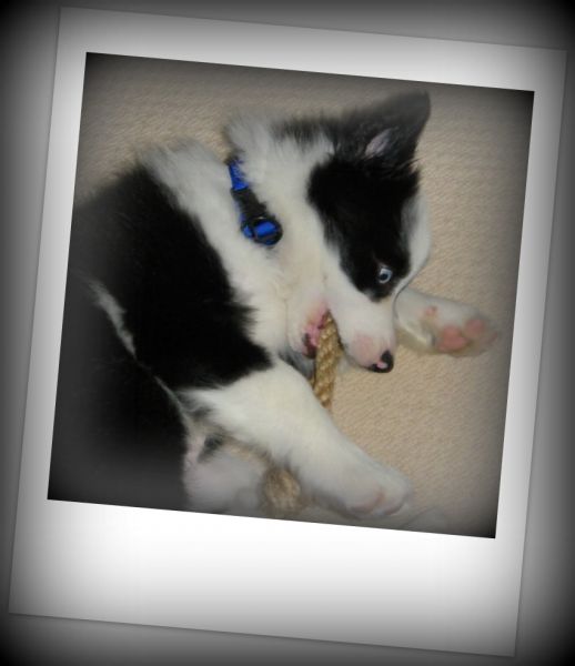 Until the pup has had all his jabs, life as we knew it is on hold. I drew the short straw so it was my turn to " baby-sit " this weekend but I've managed to sneak these few words in between all the mayhem. He's a little bundle of mischief with a personality and mind all of his own ... but he'll come round to our way of thinking ... one day. That blue eye really makes him stand out and we've already nicknamed him the " Terminator " ... ooooops ... gotta go ... Arnold wants a pee !