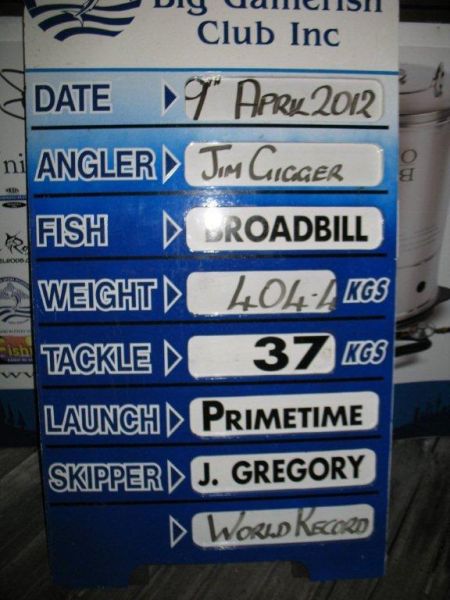 When they weighed it at the Whangaroa club weigh-station the scales showed it was 404.4 kgs ... over 30 kgs heavier than the previous record broad-bill caught in 2003 by Kiwi angler Jerry Garrett on board the boat Major Tom ll skippered by Geoff Stone.