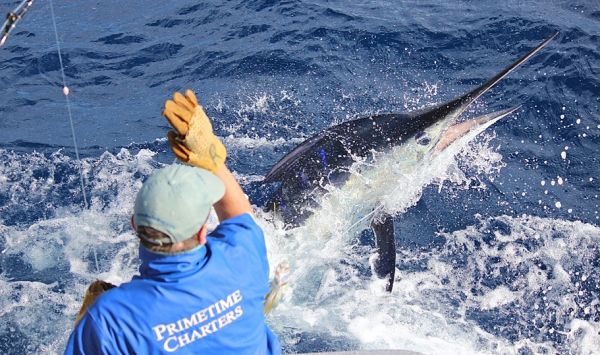 Jim's fish measured 14 ft 5 inches from the tip of the bill to its tail and was the 140 th swordfish to be landed on PRIMETIME.