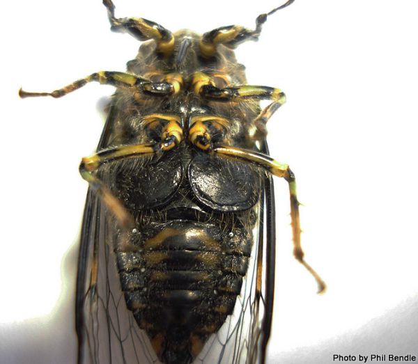 And if you look at the underside of a male cicada, directly below its legs you'll see two plates {the operculum} which cover the chambers that contain the tymbals ... the organs that produce all the noise.