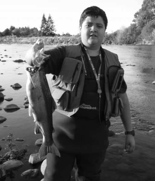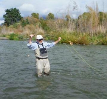 Further downstream American angler Glenn Kazo was surprised at the strength of Tongariro rainbows ... here he is "bench pressing" one in the Braids.