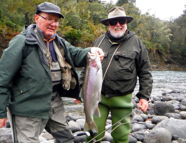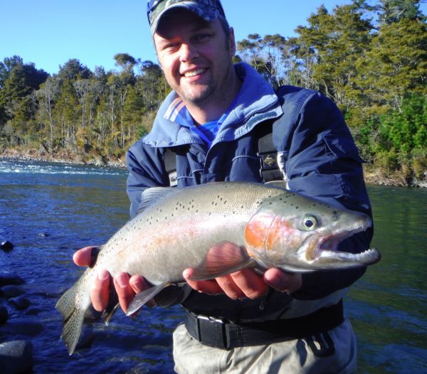 Greg Koppel {top}hooked up first cast and Dougal who was on vacation from Australia landed this good male fish from the same pool. It was his first time on the Tongariro but it didn't take him long to get the mend and drift right and once he did ... the takes kept coming.