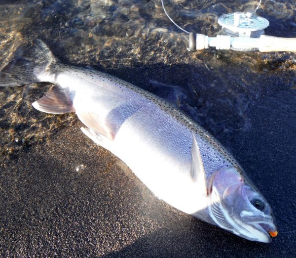 Out of the first five hook ups I was snapped three times. I thought it might be my line, so upped the tippet to 8lb. Then Paul showed up and got busted off on his first rainbow as well. I don't know what he did when he re-rigged but ten minutes later he landed the one he's holding up and shouted over "it's a good fish".