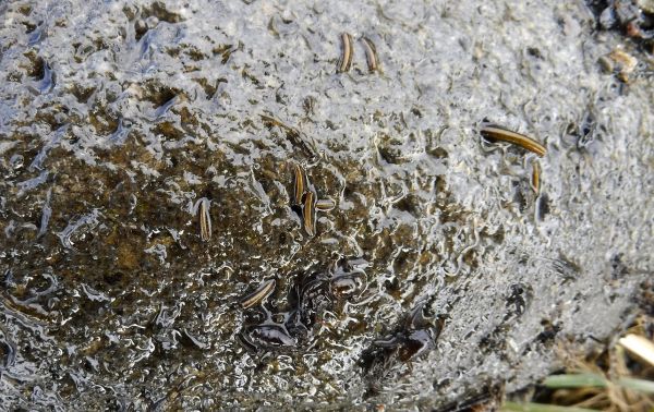 Presently there are lots of horn cased caddis clinging to the the rocks and trout eat these case and all.