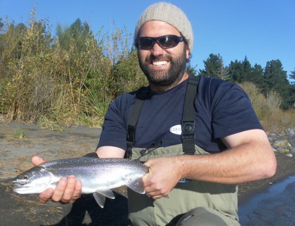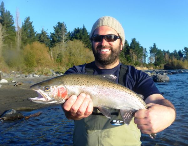 I hadn’t had a chance to get out myself before I was straight back into it with an afternoon half day on the river with Ben Smithson who was in Turangi enjoying a few days R&R with his wife and baby son. Ben is a keen boat angler and had only tried fly-fishing once some twenty years ago. He must have a good memory because it didn’t take him long to pick up the casting even though he had a tricky wind to contend with. Within half an hour he was into his first ever Tongariro rainbow and although it was only a couple of pounds Ben was surprised how hard it fought. As we moved up the pool I think he mis-heard me when I suggested putting one into the head. After a bit of bush surgery Ben went on to land another three during the afternoon in this well known secret town pool. We headed back as the light began to fade but after crossing the river above the Lonely Pool couldn’t resist a couple of chucks back across to the TRB. Half a dozen casts later he had landed a couple more but by now it was pretty dark and our day was done. Most of Ben’s fish took globugs but the last two walloped the Olive emerger fished three feet under the indicator fly so this one is still working. Ben who is a builder by trade was more than wrapped when he returned to the lodge with a limit bag. Since his time on the Tongariro he has also been offered a lucrative deal with a leading tooth-paste manufacturer. Well done Bud.
