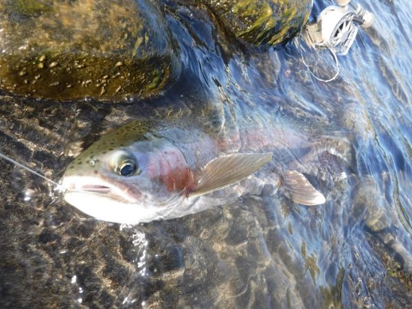 There are still a lot of juvenile rainbows in the river and if you're using small patterns under the indicator you'll inevitably hook a few during the day. For a few weeks now you'll have noticed their splashy rises {often when there's nothing obvious hatching at the time] and its a fair bet they're taking passion vine hoppers.