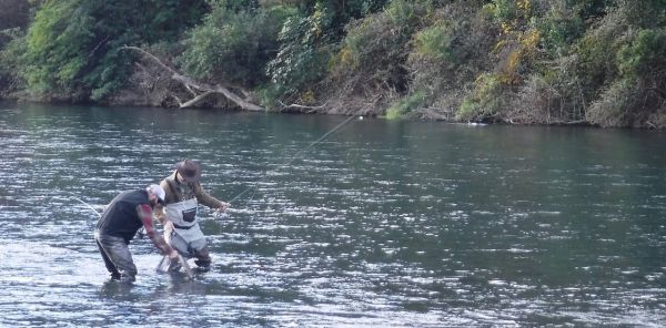Our instructors for the day weren't left out of the action either Antti had already caught fish out of shot at the head of the pool and. now after changing to the Indicator Des hooks up another brown.