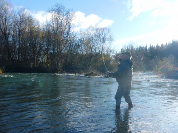 As I drove over the road bridge late Saturday morning it had dropped to a perfect 40 cumecs and was still quite colored. I booked in at TRM and after a quick chat with the wealthy owner, Jake and I went on a tiki-tour of the town area just to get some early indication of any changes and how it was fishing. Heading upriver from the bridge we spoke to a few anglers along the way and they had all caught fish. Further up these three fisho’s from Auckland had got on the river early and reaped the rewards.