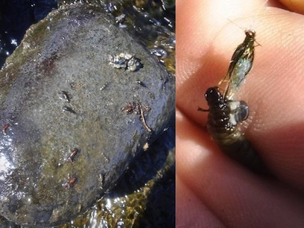 Plenty of caddis around as well. I've posted pics like the one top right before. But I hooked that caddis larvae fishing a size 16 fly while nymphing this week. There must be a lot of them in the river because the odds of snagging an insect off the bottom on such a small fly must be incredible ... and its happened several times over the years.