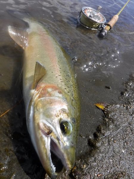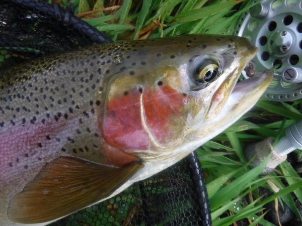 There's some "big water" here thats fairly quick, close in. Its also quite deep with changing surface currents which makes for tricky mending. Especially when you cast out a little further toward the seam. But if you get it right that indicator will dive under and the fun will begin ... or not ... depending how important it is for you to actually land the fish. Despite taking my time playing them on the 8wt, out of five hooked there yesterday I lost every one of them.