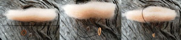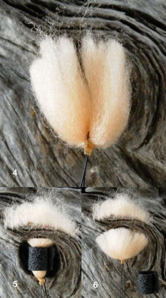 Insert the yarn into the open loop...wet the line and rubber band with some saliva then slide up tight to the yarn.This folds the yarn in half. To finish comb it with a fine wire pet brush to separate the fibers...trim the ends and you now have a sliding indicator.
