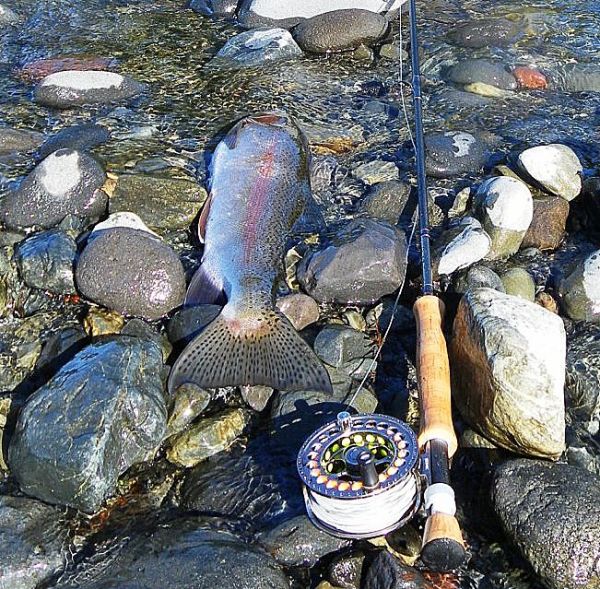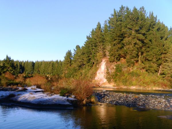 Frightened me to death because in the half-light it almost looked as if a good vet would get it back on its feet! Anyway hurrying on I got up to Judges and had the place to myself for a couple of hours. It wasn’t too bad and I landed a few by the time Paul Dyson and his dog Brodie joined us. Paul you may recall was the pin-up on our license a couple of years ago holding a nice brown and is a Tongariro regular. Unfortunately despite our best efforts the bites dried up so after about an hour we went our separate ways. I tried a couple of spots further up but only had one more hook-up so headed back to the bach taking a pic of “Babe” on the way. After a bite to eat I walked over to the Braids and was pleasantly surprised to see only one other angler in the distance.