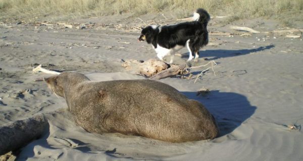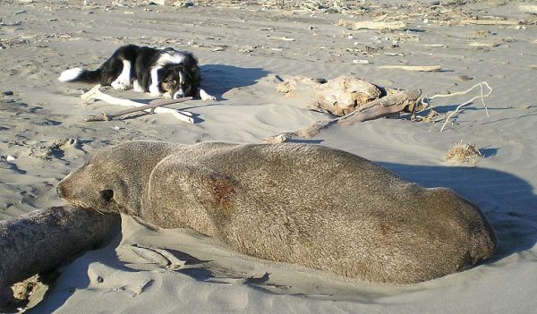 I was watching Jake surfing the net after he’d finished proof reading this report and he was looking at Boof ’s latest publicity stunt with a half dead trout and an old glove puppet. Being a bit of a beach bum as well as a river dog he was slightly more impressed with the strong fit Kahawai that Brodie had snaffled. Normally he prefers to stay out of the lime-light but he double clicked on “my pictures” and reminded me of some recent pics I had forgotten about. So here he is doing what Border Collies do best and fearlessly rounding up this vicious two hundred and fifty pound Kapiti Island seal which had strayed onto his patch…. “that’s my boy”.