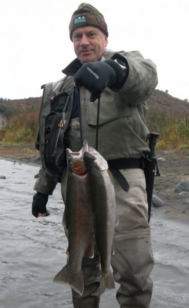 Just a quick update because I have to head home for a couple of days to see my darling...if I leave it any longer I'll forget the way. This is Stephan Baumberger who I ran into in Judges just after he had caught this brace on a dark scruffy no name nymph. Stephan is originally from Switzerland but now lives in my neck of the woods on the Kapiti Coast. He is the owner/chef of a very popular restaurant aptly called "Stephans". This fishing trip had a culinary theme because he regularly comes up with tasty trout ideas which he shares with readers of NZ Trout fisher magazine and he needed more ingredients for his recipe in the next issue.
