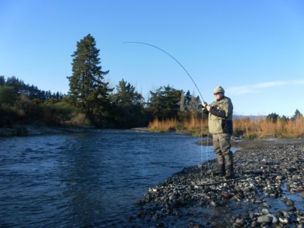 I thought it might be difficult to find David the total solitude he prefers. Surprisingly when we arrived at our first spot above Red Hut, there wasn't another angler in sight and it remained like that for the whole of the time we fished there. David is an experienced fly fisherman which makes the day a lot easier, although he had never fished with a large yarn indicator and weight he was soon putting really nice drifts through. But it wasn't until we switched methods to fish the edge of some fast riffles that our first "success" of the day came. As the big dry went under David hooked into a strong fish which caught him off guard when it took off on a run into the middle of the river.