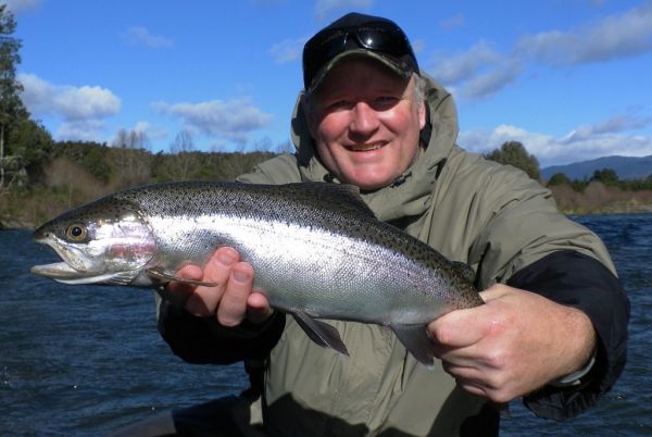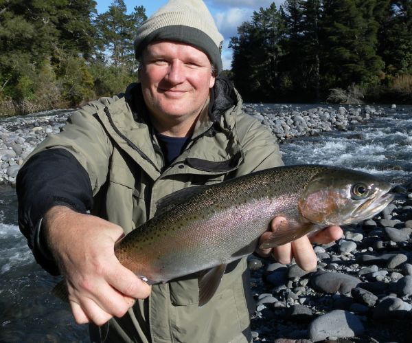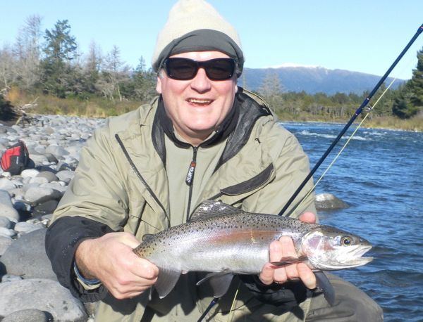 I've enjoyed this week on the Tongariro and I've been lucky enough to share some of it with a couple of great anglers who I fished with on different days. The first was Paddy Cole who you may have guessed is an Irishman. Paddy has lived and worked in South Africa for many years but at present is re-locating his company and young family to the United Kingdom. With "their home" in a container en route to Surrey for the next six weeks, they took this opportunity to visit his wife's family in New Zealand. "Pads" is a mad keen fly fisherman and it turned out we had both fished for rainbows in the trout dams of South Africa's rugged Drakensberg Mountains. My sister and brother also live in South Africa and on one of many holidays together we had spent a week in the mountains. Paddy was fishing the Tongariro for the first time so on a still crisp Turangi winter morning, stop one was a quick visit to the Braids to gently introduce him to the delights of heavy nymphs and mending a yarn budgie. I needn't have bothered because he was soon into it and on the way out nailed one in Spot X. The rest of the day was spent exploring stretches of the upper river which we almost had to ourselves. By chopping and changing methods Paddy took several nice fish and was impressed how effective the dry and dropper was. One memorable rainbow cleared the water at least six times and gave us the run around in amongst some slippery rocks before we netted it. The second day the weather couldn't have been more different. When we met up at dawn in TRM it was obvious we were going to have to contend with a very nasty cold Southerly wind, which was going to test even the best of casters. The plan was to spend the day walking and fishing the TRB between the two swing bridges. First stop Kamahi, clients always comment on this very pretty pool but by now the wind was really picking up. After a few casts we were quickly convinced to keep walking. The next couple of hours were a guide's nightmare even though we fished some untouched water the grand total was the same as the temperature... zero. Despite this Paddy was a real trooper and the jokes and stories came thick and fast even though the fishing remained tough. One thing that I had never realized before was just how many words in the Irish language begin with an "f"..."c"..."b" or "s." Paddy is without a doubt the best "swearer" I have ever come across...with the exception of my darling wife and Billy Conolly!