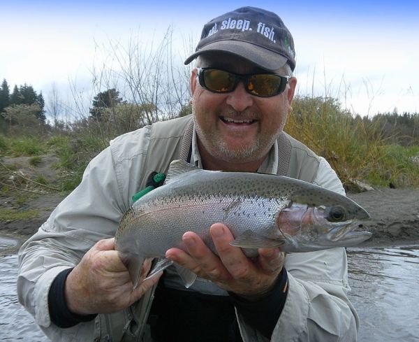 Kamahi is one of the Tongariro's pretty pools and a good place for a lunch break and a couple of cold beers. It also holds a few fish and Mark nailed one of a group we spotted in the tail, making it four...three. We continued upriver fishing Stag, Mill Race, Silly and the runs in between. They lost another one each but it wasn't really happening with no sign of any better looking fish. Considering it was a Sunday afternoon there were very few anglers around, we saw just two others all day between the Hydro and Red Hut bridge. With an hour or so left we returned to an almost deserted Braids. On the second cast Terry's indicator vanished and the rod had a pretty healthy bend in it as the fish took full advantage of the fast water. But this one was not to be and it let go as we steered it carefully towards the shallows. Mark was fishing just upstream and hooked up a few minutes later. By the end of the day he had two from this stretch that were destined for the smoker. You get a great deal of satisfaction from guiding, especially if you get a few fish. Despite the "mickey taking" these were two old mates out for some down time on the river, I think they enjoyed it as much as