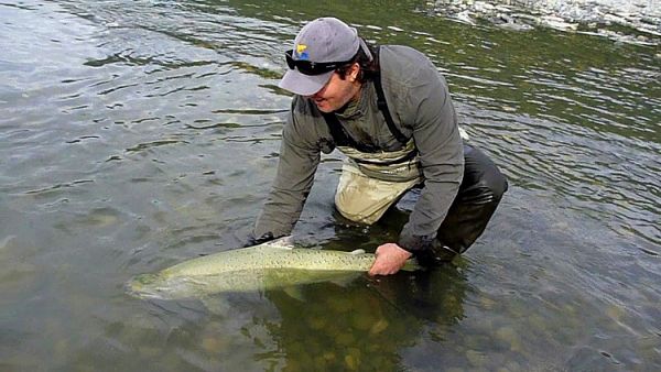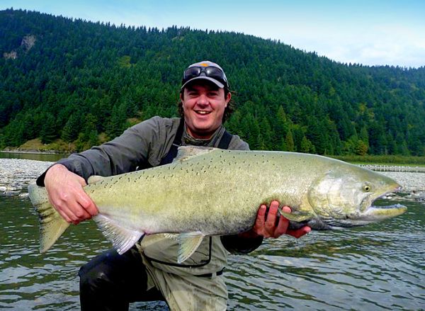 Not that I had to cast that far out because the fish were cruising up the river only about 40-50ft out from the edge and I was already standing 10ft out. But I was getting some major swing time though, then just as it swung into that 45ft range... bang... another Chinook.![Back it goes.]()