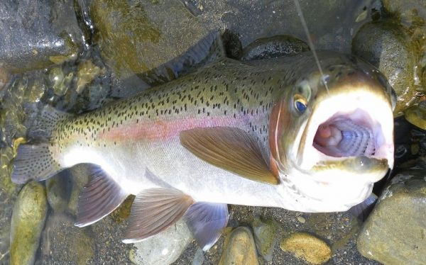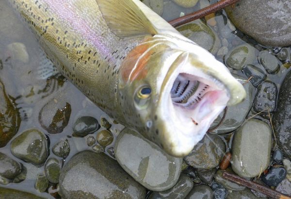 But within an hour or so the skies darkened and the temperature plummeted as a front moved through. The icy wind put a stop to any surface activity so I went back to the indicator and landed some very hungry trout. First on globugs and later small nymphs. Look how far back that globug is, even the P.T nymph is well inside this eager beavers mouth. There are still fresh run fish moving through and they will keep coming for a little while yet. But I think you will notice a slow down in the momentum of the annual spawning migration. Don't let this put you off, there are plenty of fish in the river and the recovering kelts that will be the mainstay of our sport over the summer are everywhere.