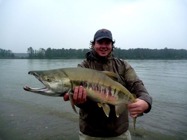 "I arrived in Vancouver and caught a bus to a small town called Chilliwack. The journey takes around two hours which is pretty good, plus you get to see a bit of the country side along the way. Once there I hired guide Curtis Meyers of B.C fly fishing charters, he has a web-site www.bcflyfishingcharters.com. The Fraser river is basically unfishable unless you have access via boat and Curtis has a jet boat so I booked him for a couple of days. In October the target species for the Fraser river are Pink salmon, Chum salmon, Coho salmon and Chinook salmon. The latter are the largest of the Pacific salmon and in some parts of the world grow up to one hundred pounds. However here on the Fraser river the big ones are forty to sixty pounds but the average would be between eighteen and thirty pounds. First day on the Fraser I hooked a pretty massive Chinook and it busted me off. Later I hooked and landed a few Pinks and a few Chum salmon, mainly Pinks though. Most of the Pink salmon had already spawned and were starting to die. It wasn't uncommon to hook forty or fifty of these a day! All you would feel was weight on the end of the rod and initially you weren't sure if you had hooked a living fish or a dead one. However when you did connect with a fresh fish you knew about it because the line would get ripped from your hands and your finger would either be cut or burned or both. Which is a great feeling when stripping flies 10 hours a day, luckily I always carry a carton of band-aids with me. I managed to catch a few Pink salmon that were reasonably fresh from the ocean and still had a bit of life in them but I was pretty keen to try and get a Chinook, so the next day we went looking for them. We fished one likely looking spot for several hours without even a strike. Curtis and I were contemplating a move to a new location but decided to give it another half hour. Suddenly over a hundred meters away we saw the bow waves of a few fish coming up the river. Now you have to try and time it so your fly is swinging by at the right time. I managed this bit ok because a fish nailed the fly and took off down stream. First the fly-line then fifty meters of backing were towed off the reel, then everything went slack as the 20lb tippet busted. They can have sharp teeth and sometimes the line gets caught on them. Anyways Curtis tied on another fly, a big red marabou streamer with lots of gold tinsel and it wasn't long and I was onto another Chinook. The fish took the fly and started jumping and rolling, then raced off downriver and I had to follow. I was about 80 meters down before it was finally landed and boy was I relieved to finally get a Chinook, from memory it weighed around eighteen pounds. The fish was released and the pressure was off so I started to relax a bit more. I'm still not sure why I felt like I had to catch a Chinook but it was a great feeling and I started bombing these long double hauls out in the the main flow.