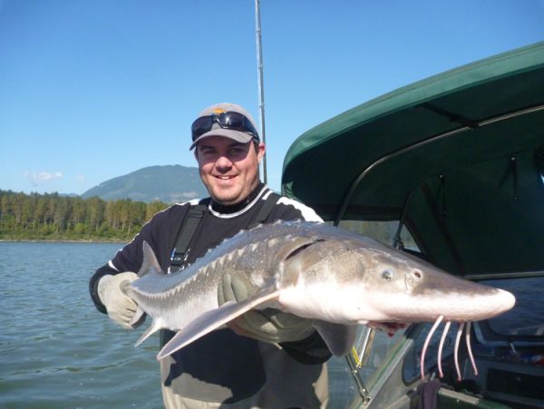 I started and had got back a bit of line but he was still going down stream. Off he went off again... taking more line and I had to follow. Before I knew it I ended up 250 meters from where I started. Curtis had the net ready and after several attempts he finally went in... woohoo !! A 30lb Chinook salmon on the fly... I was pretty happy and booked a days Sturgeon fishing for later in the trip.![Bait fishing.]()