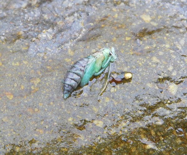 Today is the Lake Taupo Cycle Challenge New Zealand's biggest cycling event that attracts over ten thousand riders annually. I don't envy the competitors because the gusts are worse than ever this morning. Next week they have forecast a return to much lighter winds with isolated rain or showers. This will provide more pleasant fly fishing conditions and encourage anglers back onto the river. We should see a lot more fish getting caught and get a better idea of whats happening out there. The caddis pupa below was photographed just above the Poutu at the beginning of the week. I've seen a lot of these recently, vibrant greens and probably around a size 12 hook.![Green caddis pupa.]()