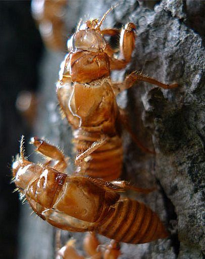 On many of the trees downriver you'll see the dry, brown outer skins discarded during the nymphs final molt. The posh name for these are the cuticles or exuviae and they can often remain stuck to the sides of tree trunks and branches for months after the emergence of the adult cicadas. ![Can't wait.]()