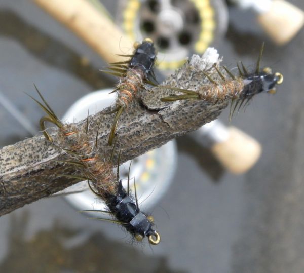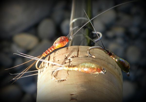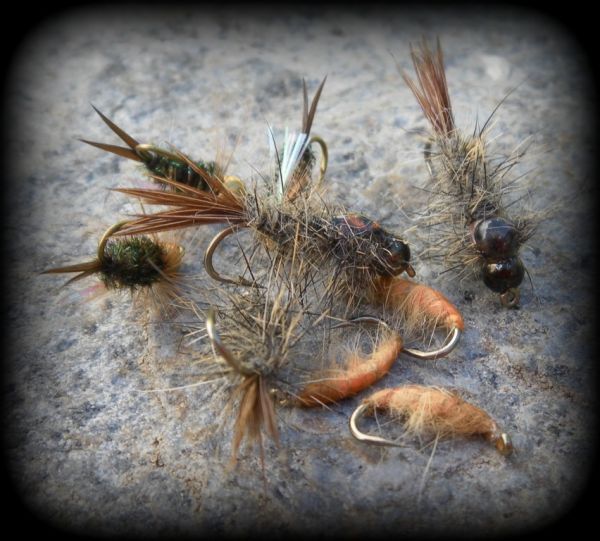 If you have chosen your water correctly you will be fishing over depth but not necessarily hard down. The middle nymph is always weighted, I use a bead-head caddis emerger. The much lighter point fly can be another caddis imitation or some form of mayfly or generic nymph like a small Pheasant Tail, Hare's Ear or Cadillac, just look under a few rocks and see whats around.
