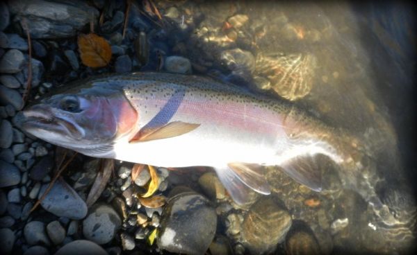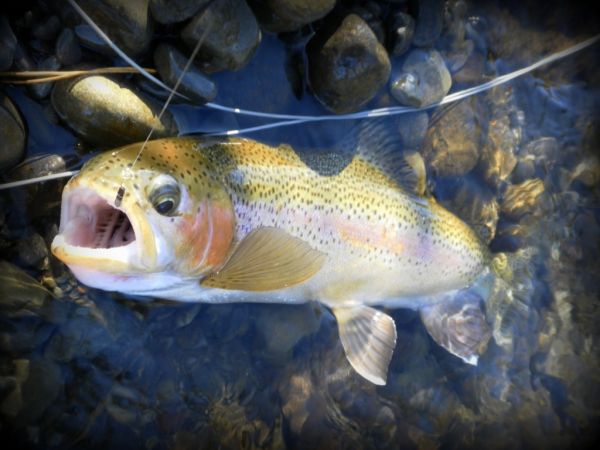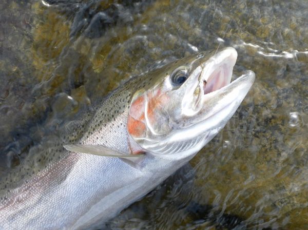 I hooked up to some fit deep bodied jacks and typical of male rainbows they attempted to bully you from the moment you struck. All of them came from one stretch with deceptively fast flowing water between me and the fish. It was lucky I was using the 8 wt and indicator rig in here because a couple of times I had to chase fish downstream in order to land them. Talking to others my impression is there are fish right through from the bottom of Grace Rd to the Upper reaches. I spoke to one angler who had caught his share of rainbows and a 9 lb brown wet-lining the Hydro and I bet that won't be the only one this week. Not that many anglers around and with a cold settled spell until Sunday, then showers for the early part of next week it should be good.