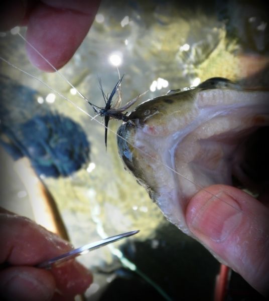 Although the image on the left shows a modified deer hair cicada used to register any interest;I also carry several different large patterns in various colors for changing light conditions on the river, black is particularly useful when there is a lot of reflected light on the water.
