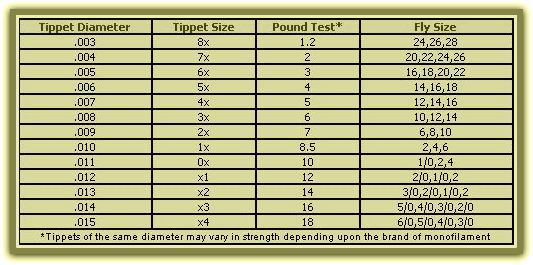 " Most fishermen are accustomed to identifying ‘fishing line’ by its “pound test” rating; i.e., the breaking strength. In flyfishing, leader and tippet material are primarily designated by their diameter. While this can be used to infer an approximate breaking strength range, in reality, the diameter does not, of necessity, translate into a specific “pound test” designation.
