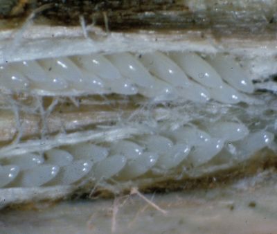 Once above ground the female deposits her eggs into plant tissue using a sword-like appendage called an ovipositor where the eggs look very much like grains of rice.