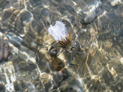 Trout can become totally pre-occupied with them providing the angler with exceptional surface action.There are plenty of commercial patterns available many tied using foam or spun deer hair. I prefer the latter, foam rubber is buoyant but its heavy and tends to sit a bit low in the water which makes them difficult to spot. Even the deer hair version can sometimes be hard to track so I tie in a little bit of bright orange yarn behind the eyes.